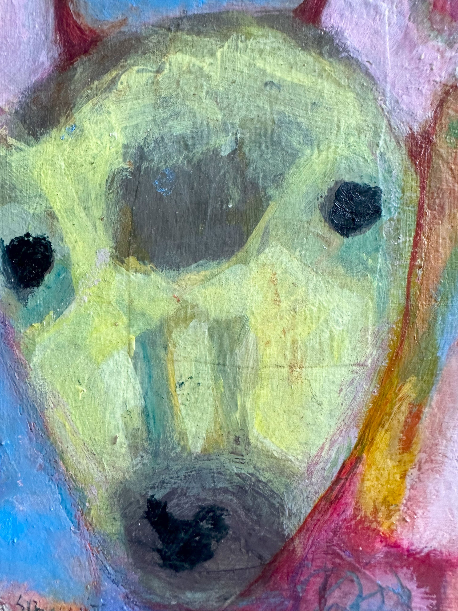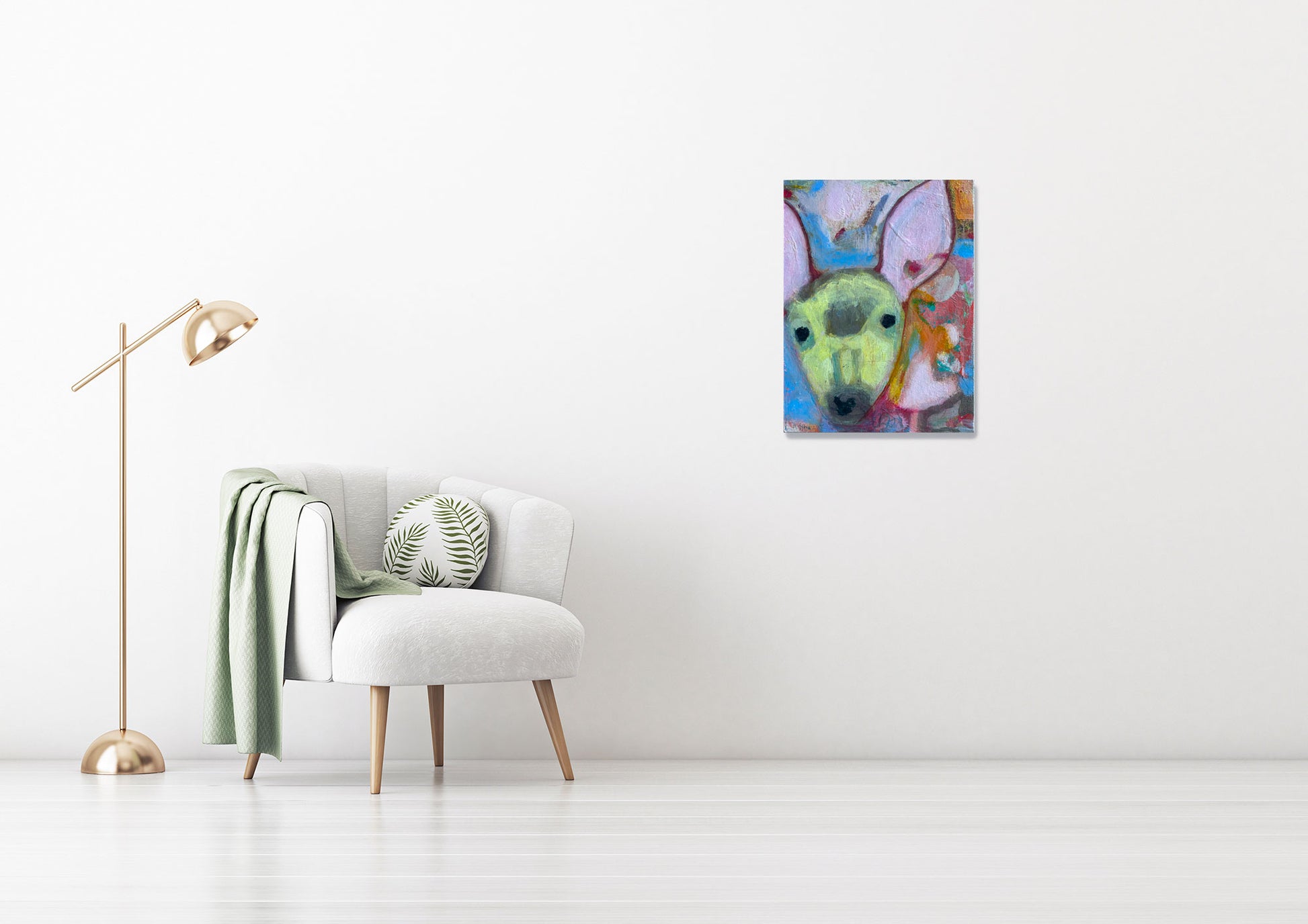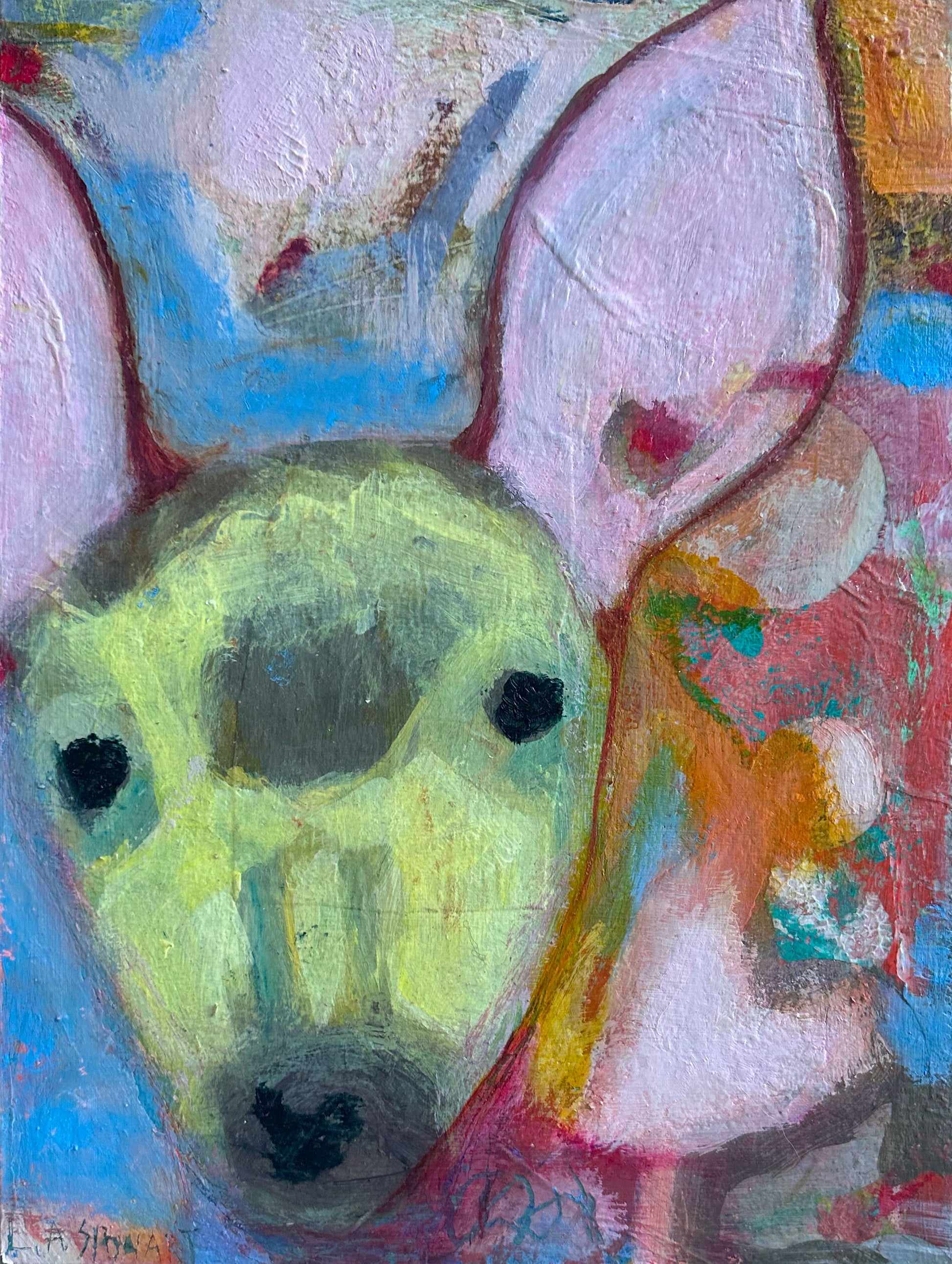 In Oh Deer, Lesley captures a tender, haunting moment through the wide gaze of a deer rendered in pale greens and soft violets. The background pulses with warm, gestural strokes of pink, orange, and turquoise, adding a dreamlike energy to the composition. The surface carries traces of both innocence and unease, inviting the viewer into an emotionally layered encounter with the natural world.